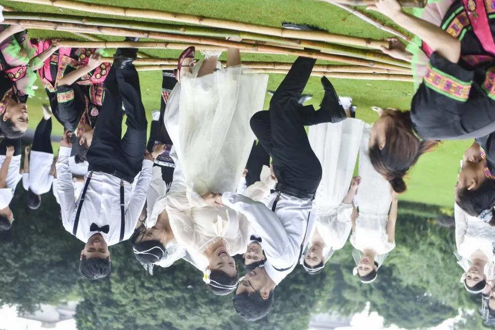 上午9點08分,30對新人在別具風情的黎族歡迎儀式中開啟了浪漫的求婚之旅,熱情歡快的竹竿舞、青春洋溢的快閃舞蹈,將現(xiàn)場歡樂氣氛推向高潮。