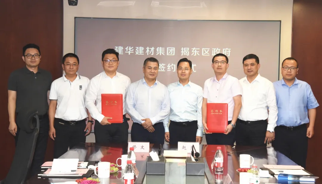 5月25日,建華建材集團(tuán)與揭陽市揭東區(qū)人民政府舉行裝配式建筑產(chǎn)業(yè)基地項目簽約儀式。揭東區(qū)委書記方烽,區(qū)委副書記修文,市招商引資辦副主任、中德金屬生態(tài)城黨工委書記、管委會主任林仲龍;建華建材集團(tuán)董事長王剛、總裁助理兼投資發(fā)展辦主任汪峰、惠州建華副總經(jīng)理趙勇、礦產(chǎn)事業(yè)部副總經(jīng)理石柏峰等領(lǐng)導(dǎo)出席簽約儀式。